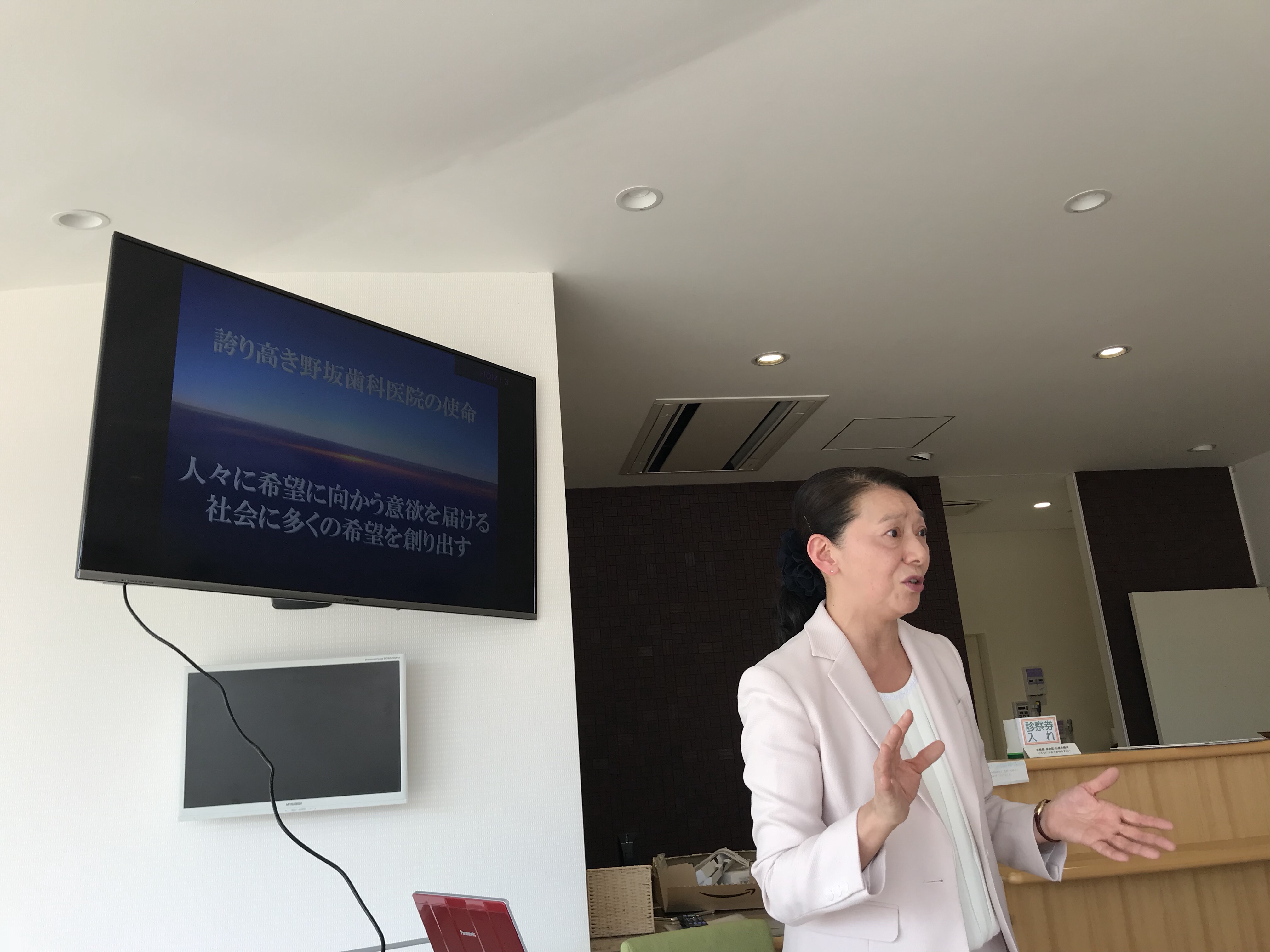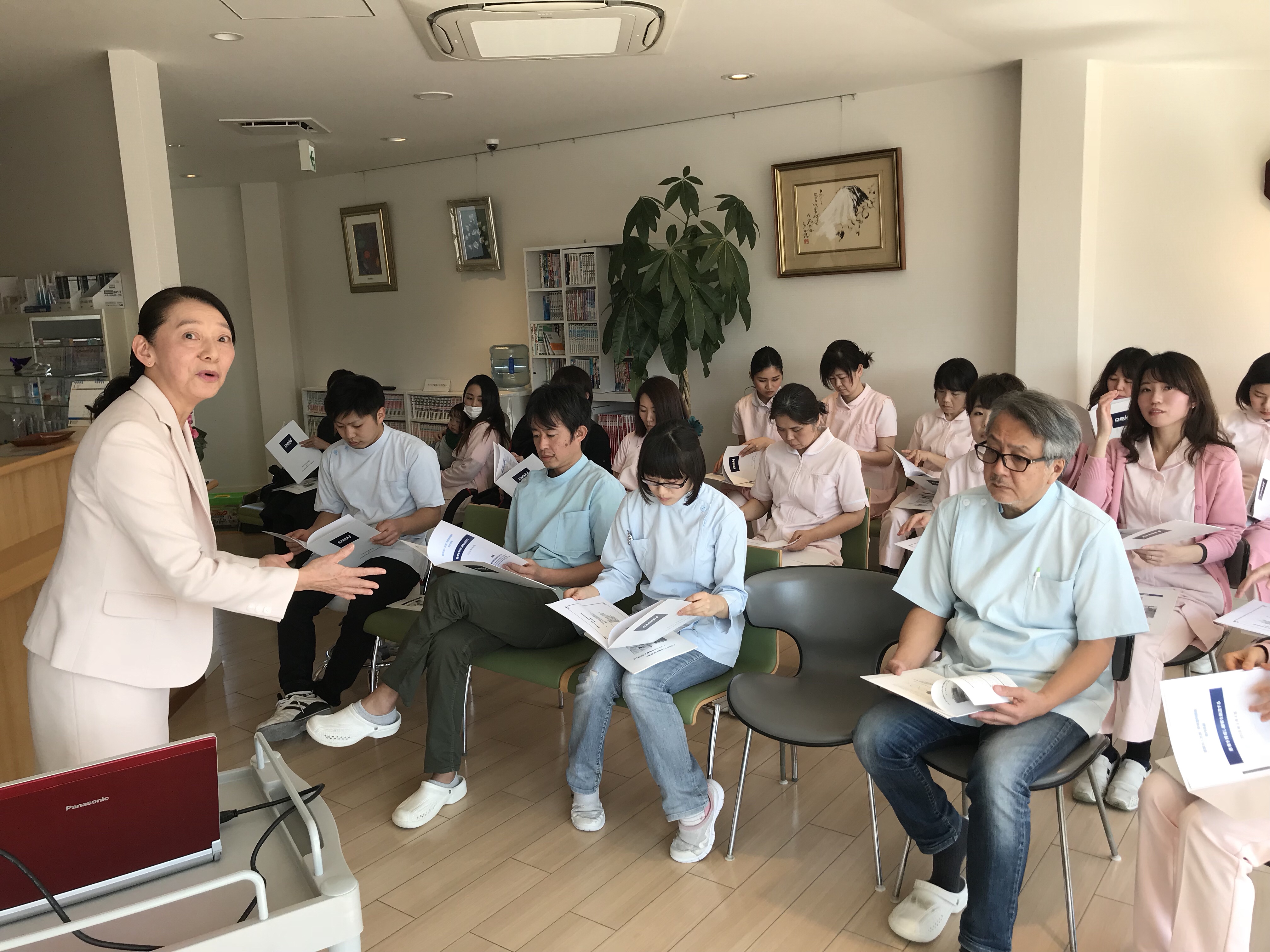 今日は患者さんにどのように問診を行うかなどといったカウンセリングの基本を向先生に来て頂き講義して頂きました。患者さんと関わる全スタッフが出席して実際に患者役などにもなってお互いの相互実習も行いました。まだまだ様々な自分達に足りないところがはっきりわかってきたように思いました。